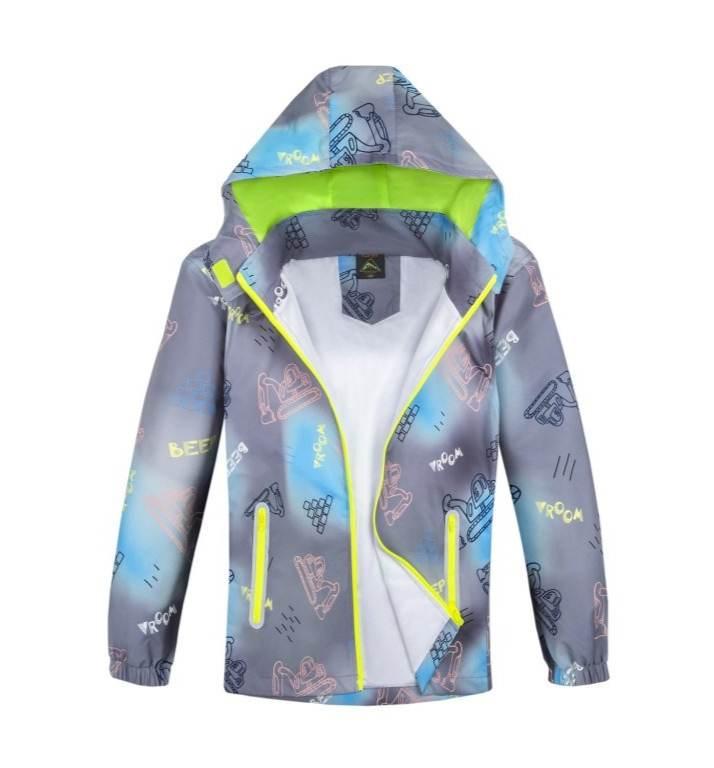 Chlapecká bunda jaro/podzim, perforovaná (dírkovaná) podšívka, nepromokne, neprofoukne, odepínací kapuce, která lze u krku stáhnout na suchý zip, dvě kapsy na zapínání, reflexní prvky.