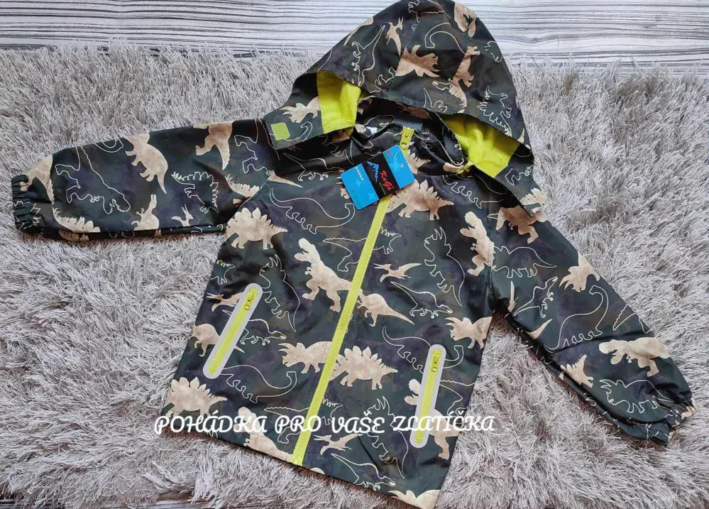 Chlapecká bunda jaro/podzim, perforovaná (dírkovaná) podšívka, nepromokne, neprofoukne, odepínací kapuce, která lze u krku stáhnout na suchý zip, dvě kapsy na zapínání, reflexní prvky.