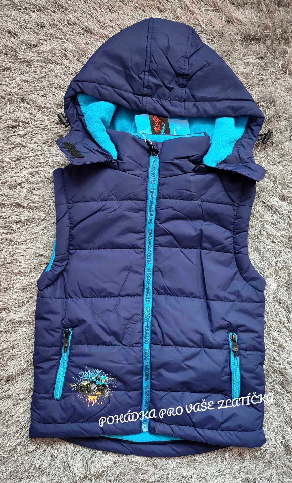 Zimní prošívaná vesta zn. Kugo, prodloužená záda, dvě kapsy na zip, voděodpudivá, kapuce odepínací, stahovací olivka v pase a v kapuci, teplá fleecová podšívka. JSOU O 1-2 ČÍSLA VĚTŠÍ! Orientační rozměry:Vel. 98 - celková délka 46/52cm, šířka v průramcích 40cmVel. 104 - celková délka 47/54cm, šířka ... celý popis